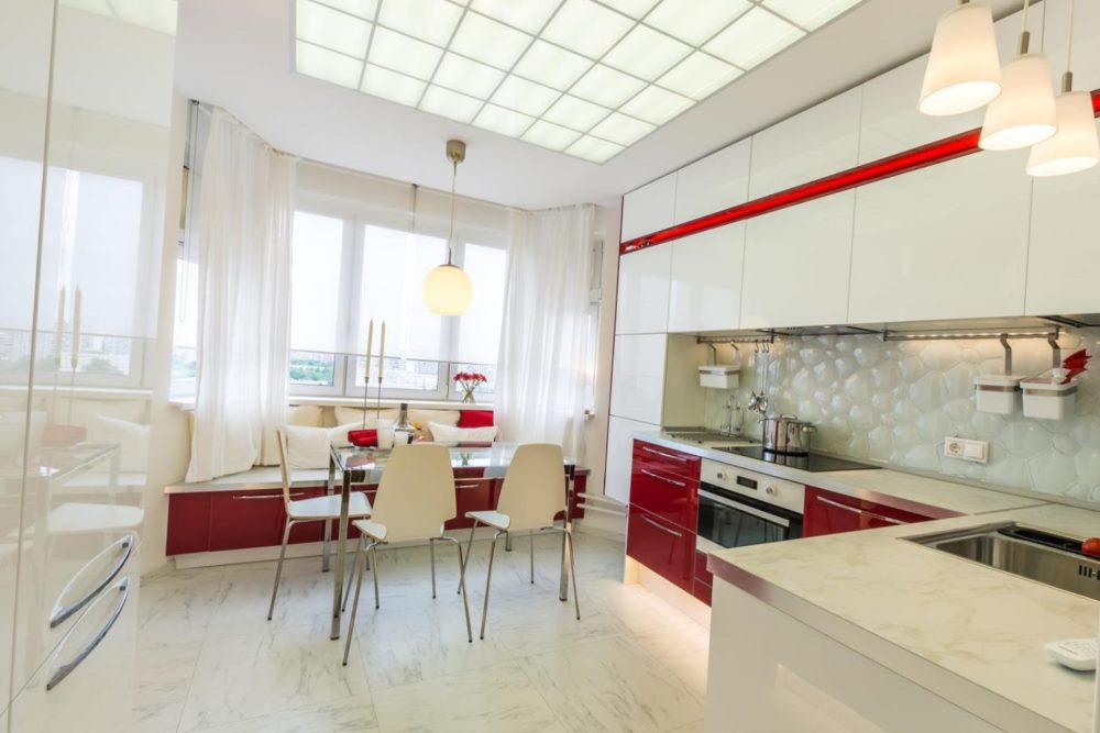 Si vous souhaitez augmenter visuellement la baie vitrée, vous pouvez installer autour d'elle des armoires hautes ou des armoires suspendues.