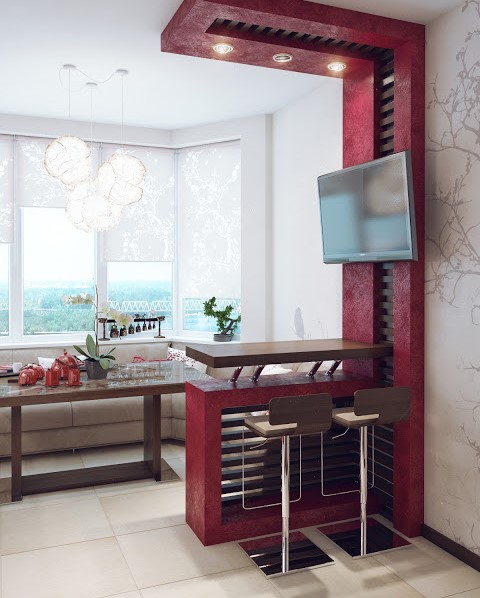 La baie vitrée est entièrement vitrée comme une lampe de poche, ou seulement partiellement. Il peut être séparé par un écran, un rideau, un comptoir de bar - vous obtenez une autre pièce. Parfois, l'espace de la baie vitrée est attribué à l'aide d'un plancher à plusieurs niveaux, d'un plafond.