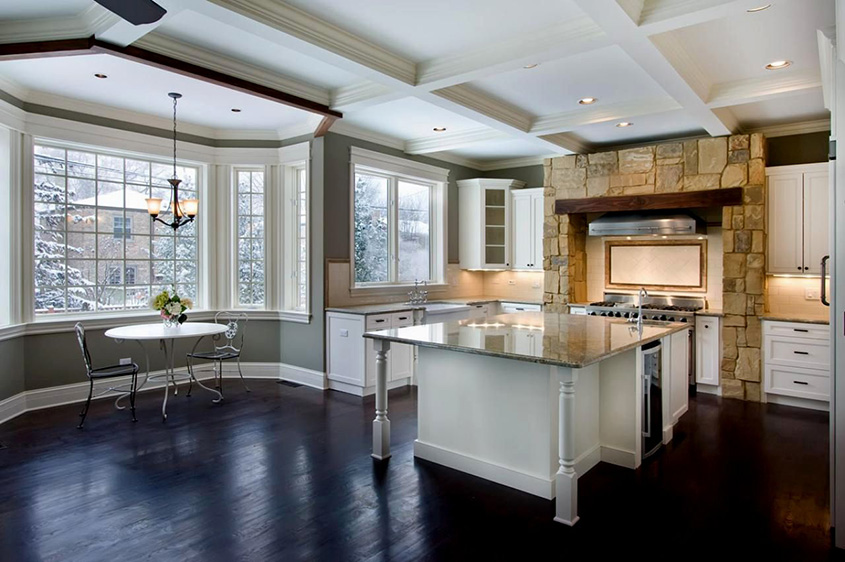 Caractéristiques de l'aménagement de la cuisine avec une baie vitrée