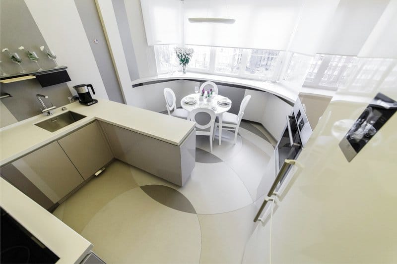 Il n'est pas pratique de placer la table de cuisson et la cuisinière à gaz dans la baie vitrée - les fenêtres s'embueront constamment et deviendront sales avec des gouttes d'huile et de graisse. Une idée intéressante est la présence en elle d'un petit jardin d'hiver, un lieu de gymnastique, de yoga.