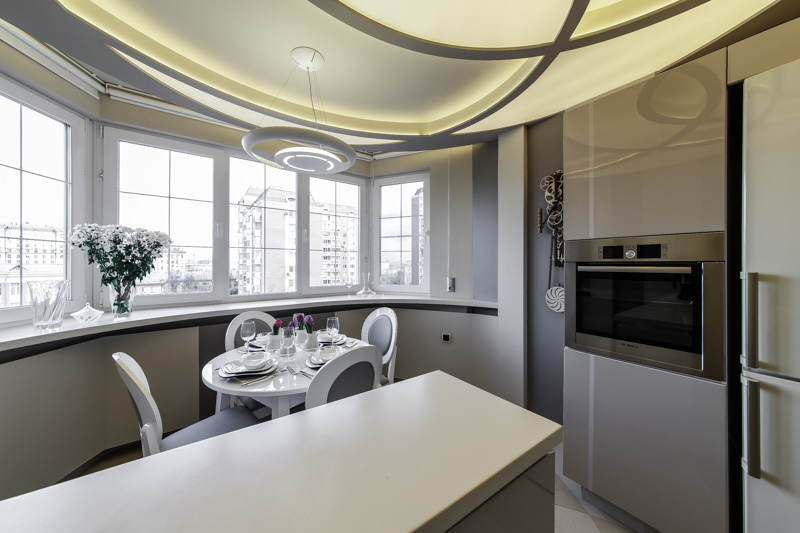 Baie vitrée - une corniche architecturale dans le mur, reliée à la pièce principale. Il y a un semi-circulaire, triangulaire, trapézoïdal, polygonal et ainsi de suite. Sa présence donne à l'appartement un maximum de lumière, mais il complique grandement la décoration de ce lieu. Le design à la mode moderne de la cuisine avec une baie vitrée est décrit en détail dans le texte de l'article.