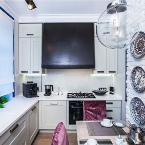 Coin cuisine de 9 m². les compteurs peuvent être non seulement un endroit pour cuisiner, mais aussi un coin confortable pour les réunions de famille.