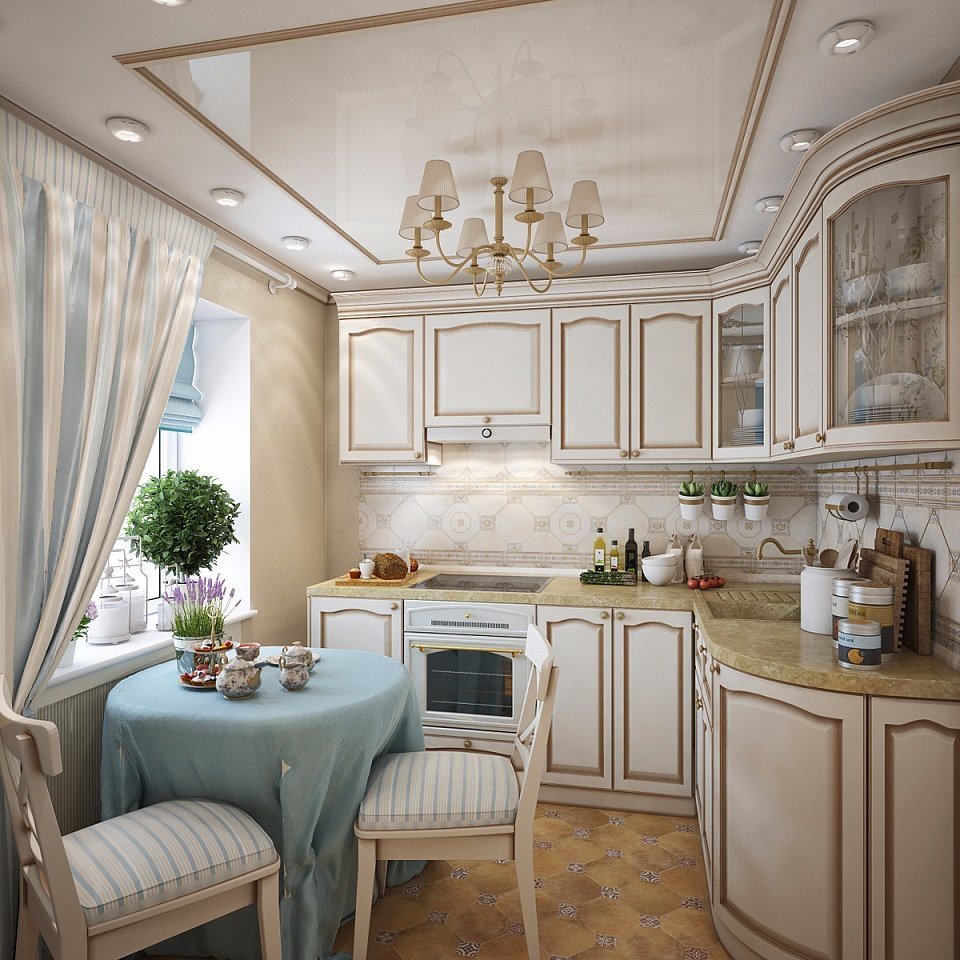 Coin cuisine de 9 m². les compteurs peuvent être non seulement un endroit pour cuisiner, mais aussi un coin confortable pour les réunions de famille.