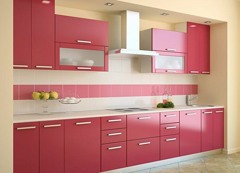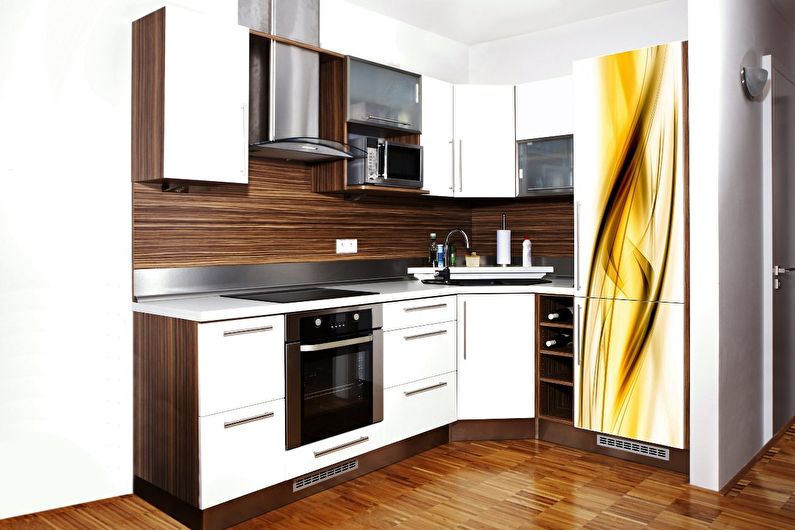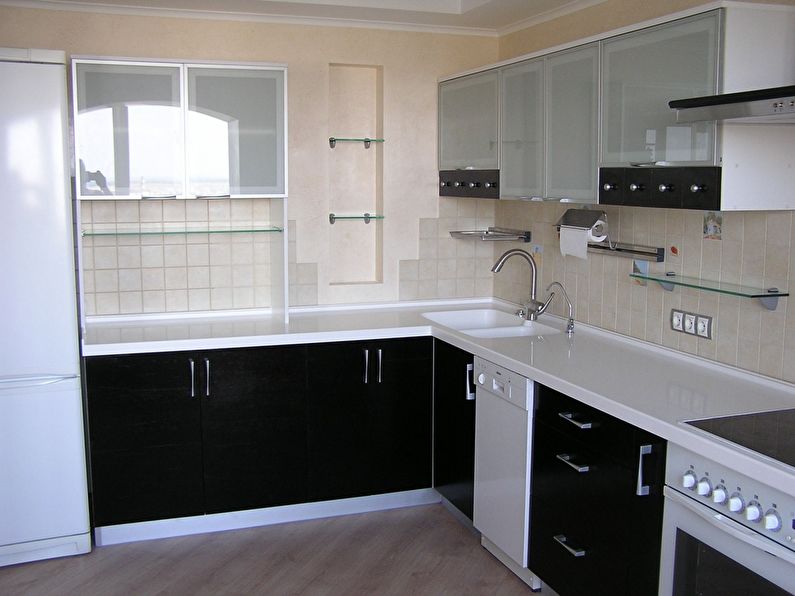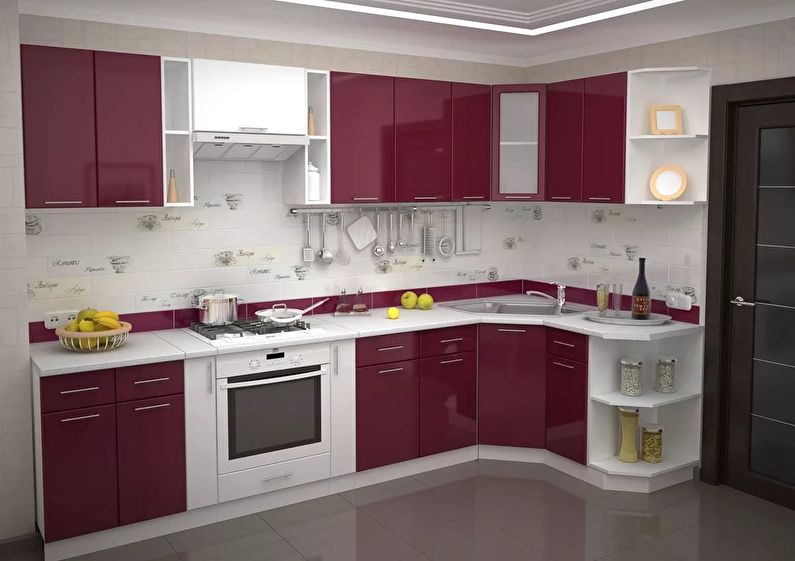 L'ensemble de cuisine est acheté avec des façades blanches des armoires inférieure et supérieure (à charnières). Les portes des armoires murales sont constituées de fines feuilles de contreplaqué ou de panneaux de fibres avec une perforation fine qui ressemble à un motif.