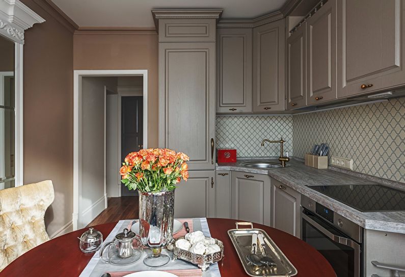 Tout le caractère du style anglais s'exprime dans la cuisine de 9 mètres carrés. Façades sculptées d'armoires au sol et murales, comptoirs en pierre coûteux, tablier inhabituel en pierre naturelle lisse - tout cela est présent en abondance.