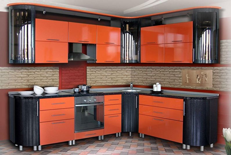 - Après avoir choisi une référence de couleur, choisissez un ensemble de cuisine, une table, des chaises et des appareils électroménagers. Si la cuisine a des étagères à charnières ouvertes pour la vaisselle, les nuances de ces dernières joueront également un rôle important dans l'organisation du design.