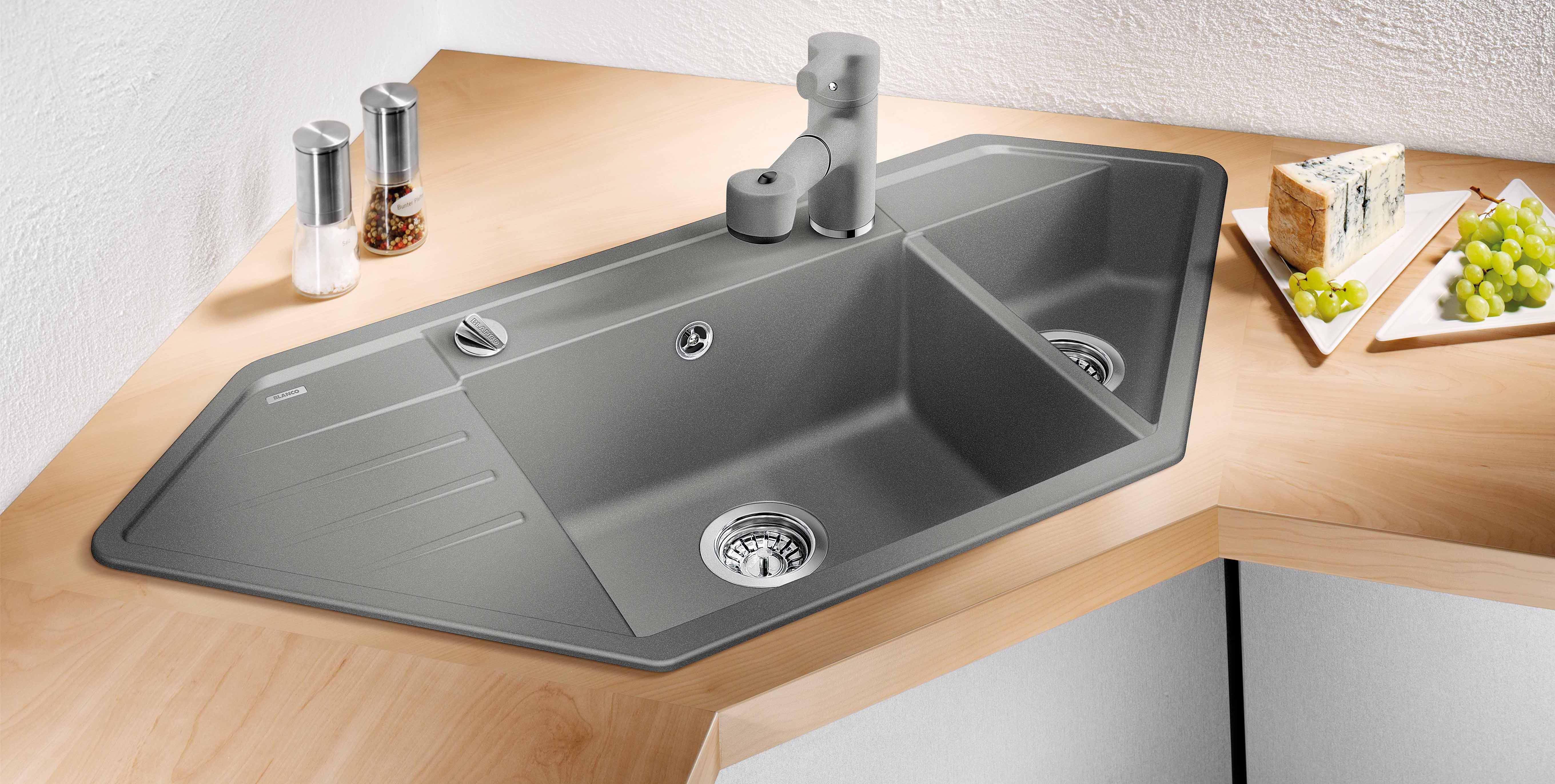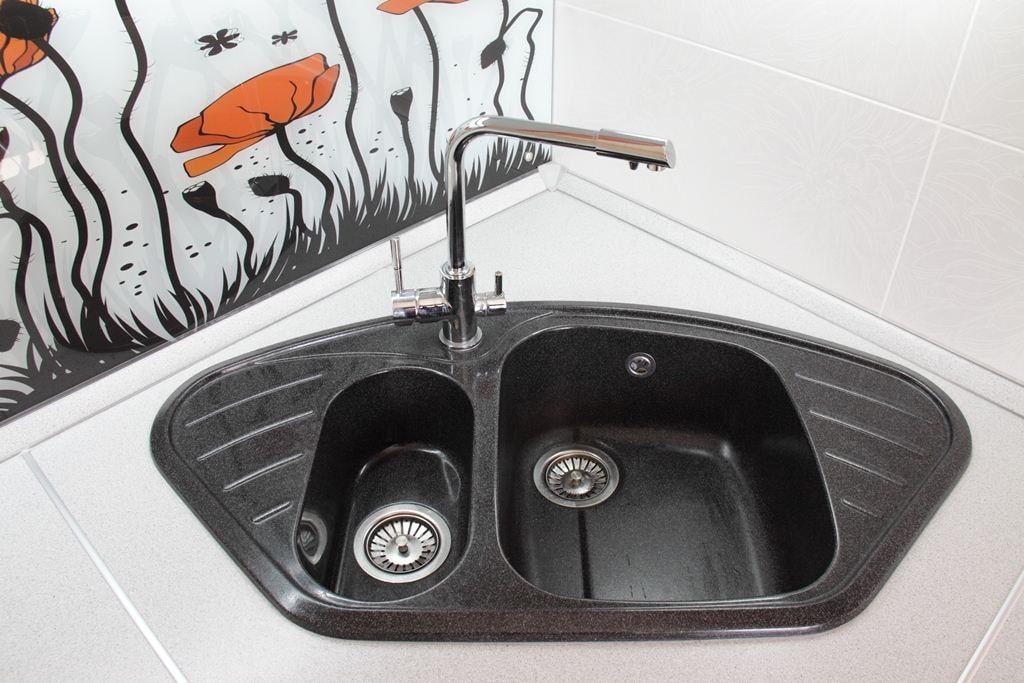 - Autres - en plus des formes standard géométriquement régulières, les éviers d'angle sont populaires. Ils économisent de l'espace sur le plan de travail, mais en même temps, se démarquent d'une manière d'installation inhabituelle.