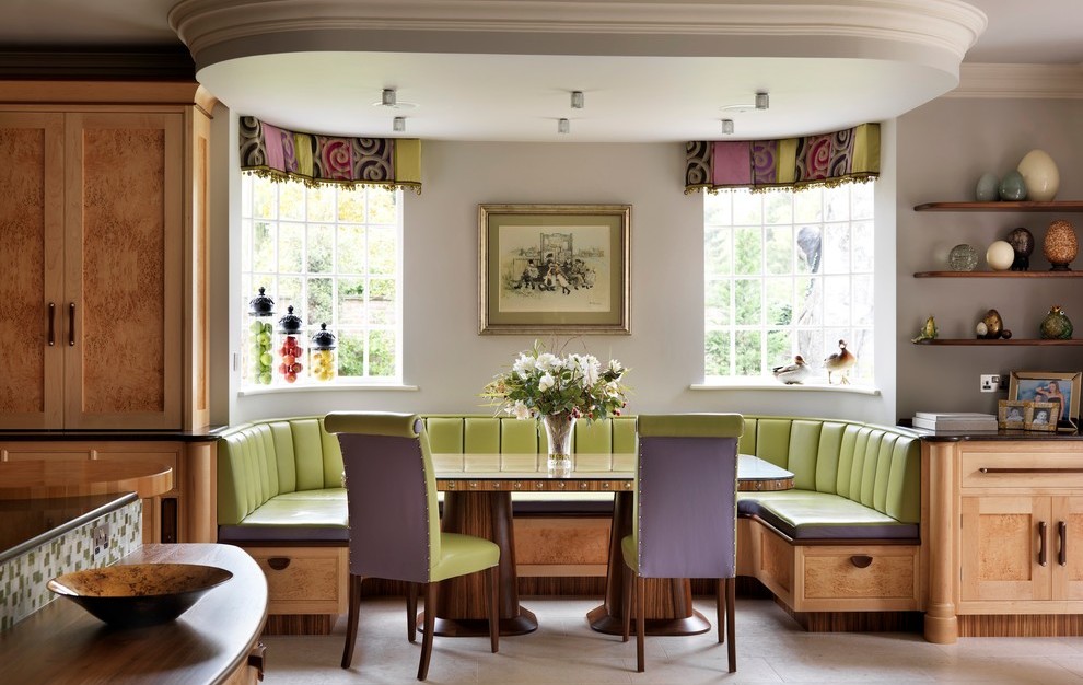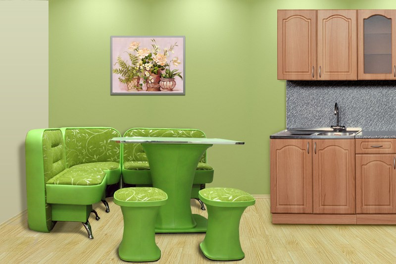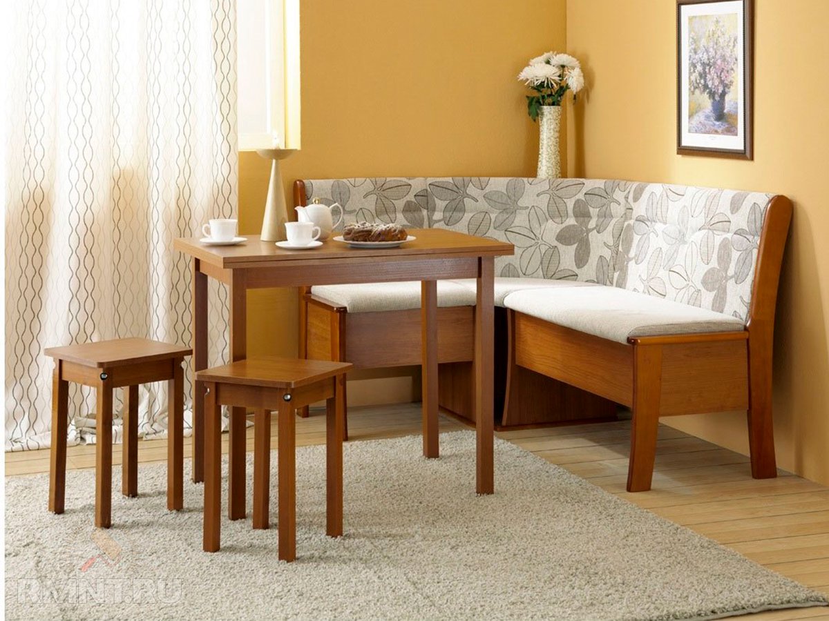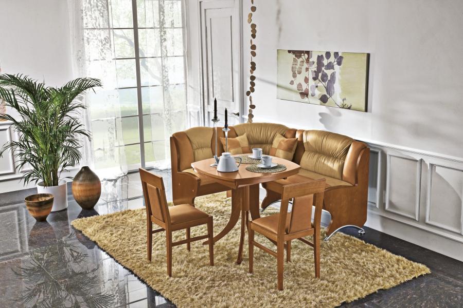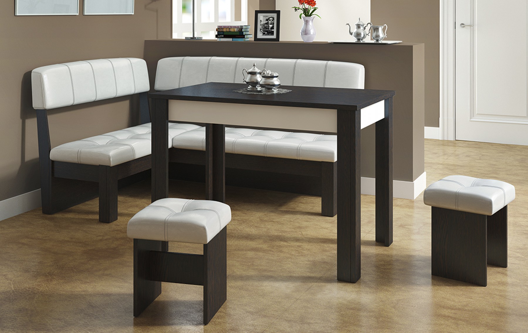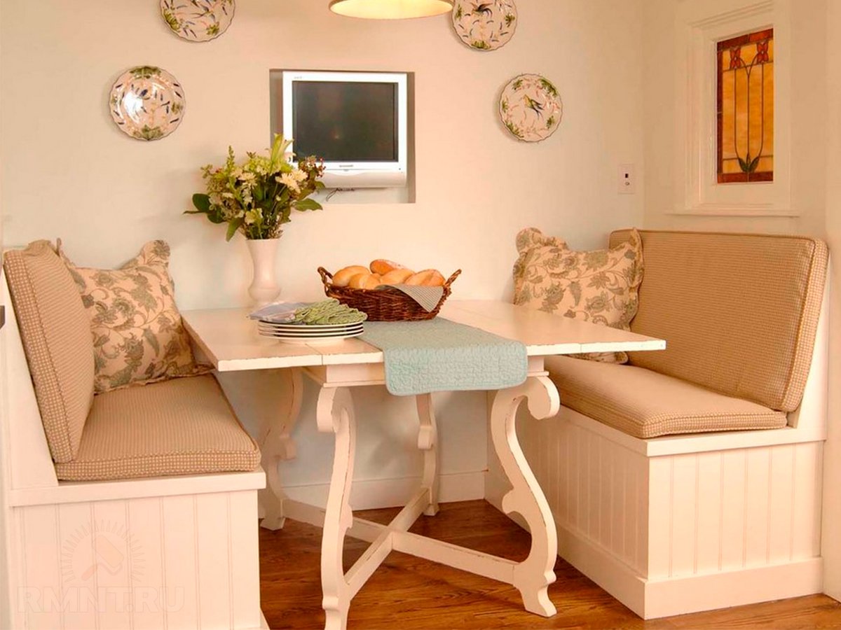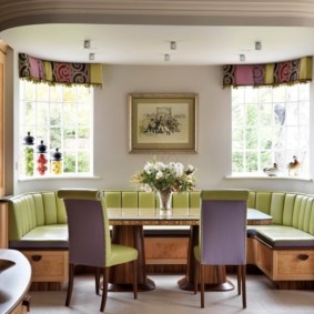 C'est une autre des options les plus réussies, qui convient à la décoration d'une petite cuisine. Cette solution est avantageuse pour plusieurs raisons. Le premier, et peut-être le plus évident, gain de place. La seconde est la possibilité de placer un grand nombre de personnes autour d'une table. Les zones du troisième coin sont souvent, presque toujours, libérées avec un stockage supplémentaire sous les sièges. Ce fait peut jouer favorablement dans la cuisine, dont l'espace est strictement limité et les armoires supplémentaires ne gêneront pas.