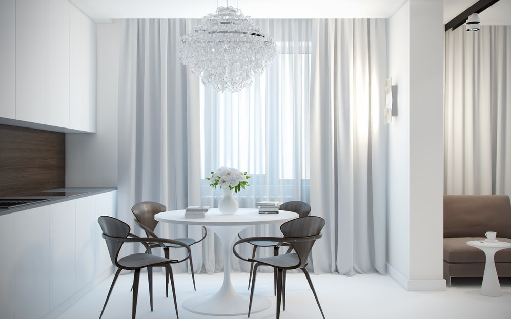 Avez-vous un studio de cuisine moderne? Ensuite, vous n'avez tout simplement pas d'autre choix que de centrer cette zone. Après tout, vous devez en quelque sorte remplir l'espace vide de la pièce? Si vous aimez les fêtes bruyantes et qu'un soir vous aurez besoin de beaucoup d'espace pour la piste de danse, alors la table doit être réorganisée sur l'un des murs. Et s'il glisse pour vous, c'est plusieurs dizaines de fois plus pratique!