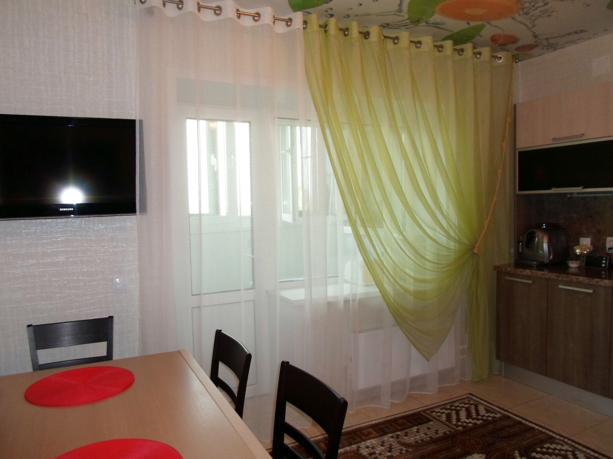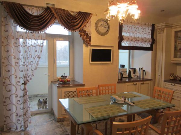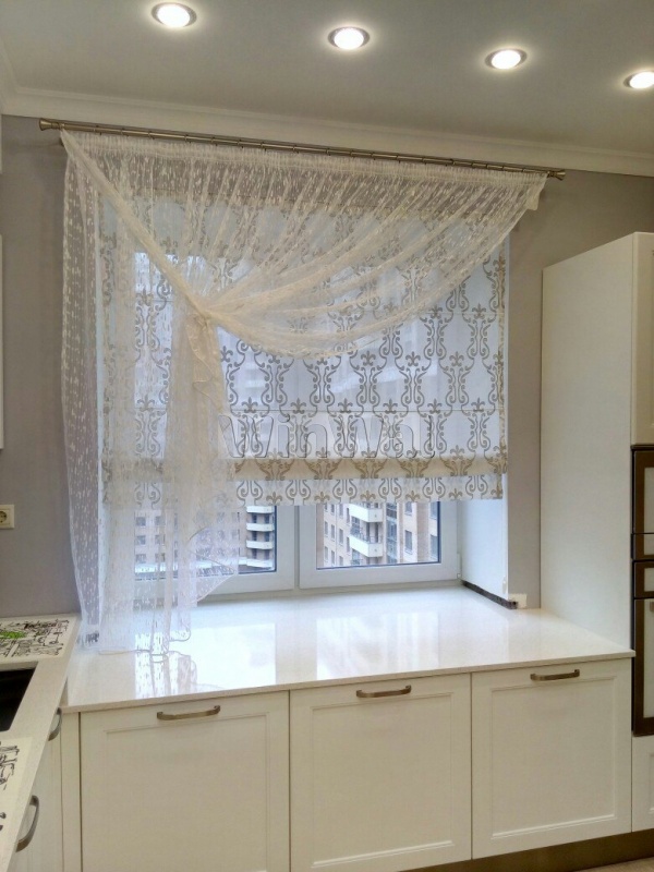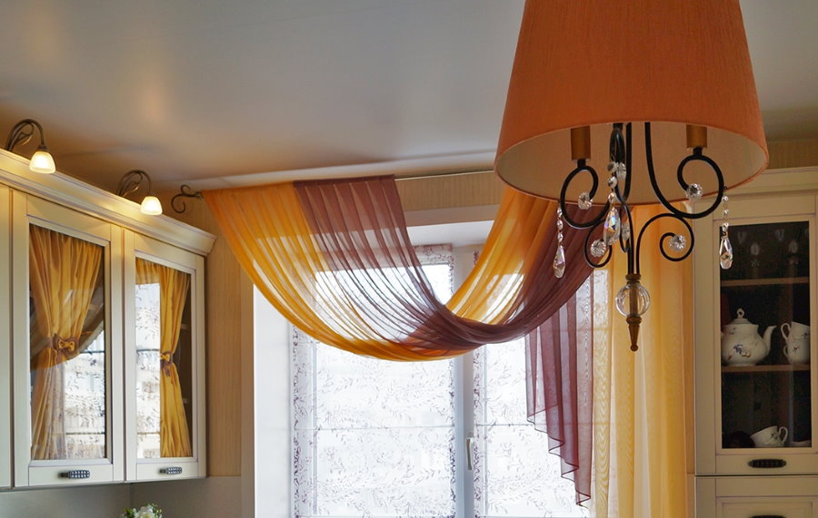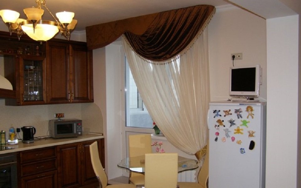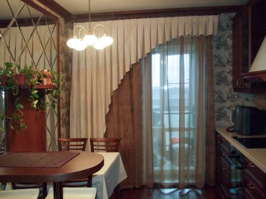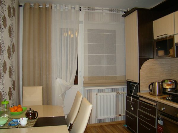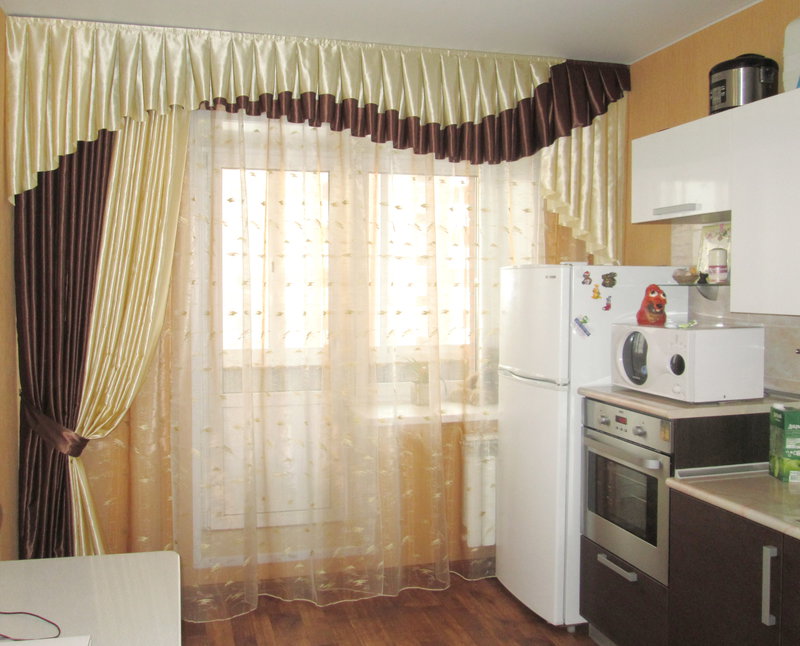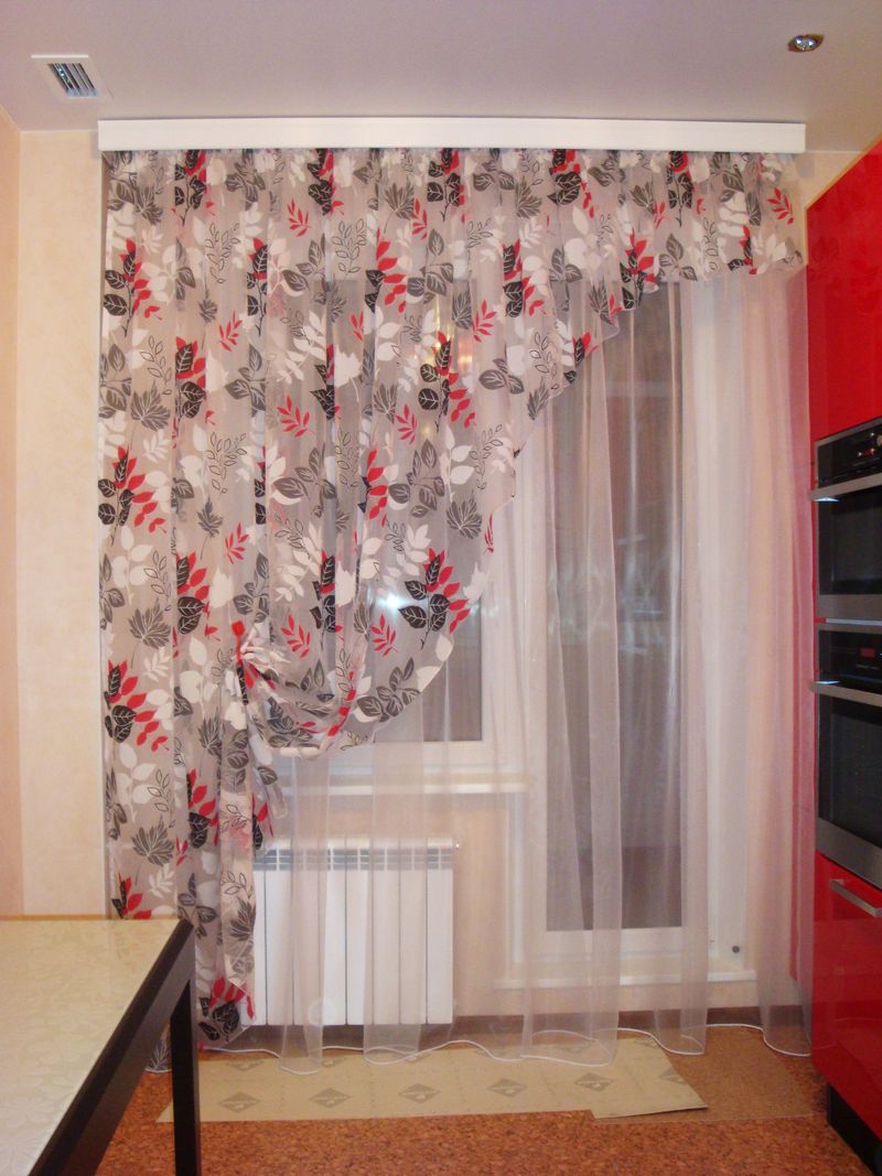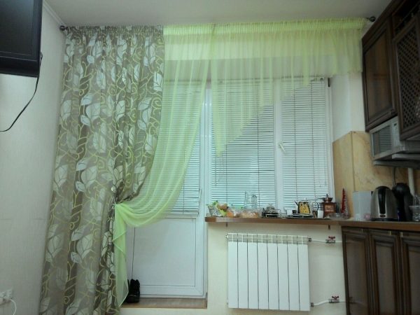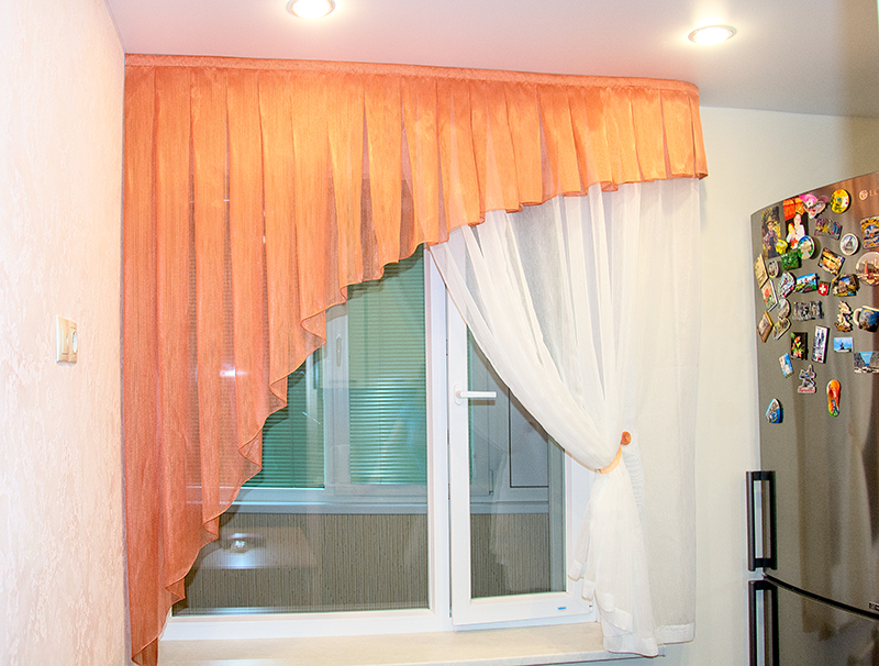 Si la fenêtre de la cuisine est adjacente à la porte de la loggia ou du balcon, vous pouvez acheter des rideaux asymétriques d'un côté, dont l'un est plus long et l'autre plus court. Élégant, et jusqu'ici rarement vu.