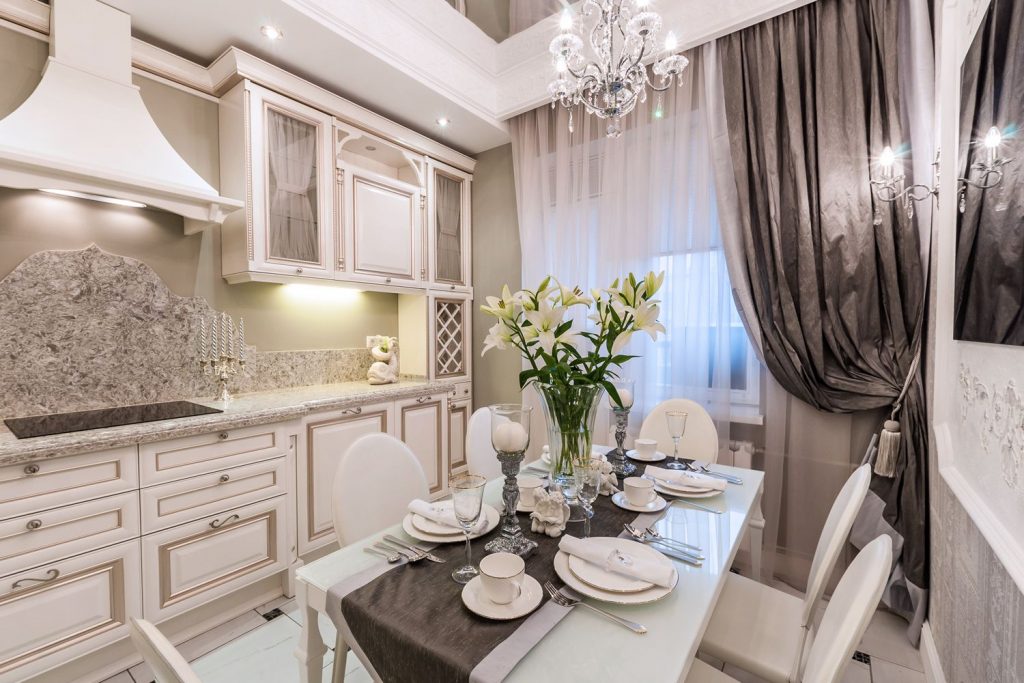 Des rideaux occultants avec un lambrequin en tissu coûteux conviendront dans une cuisine de style classique
