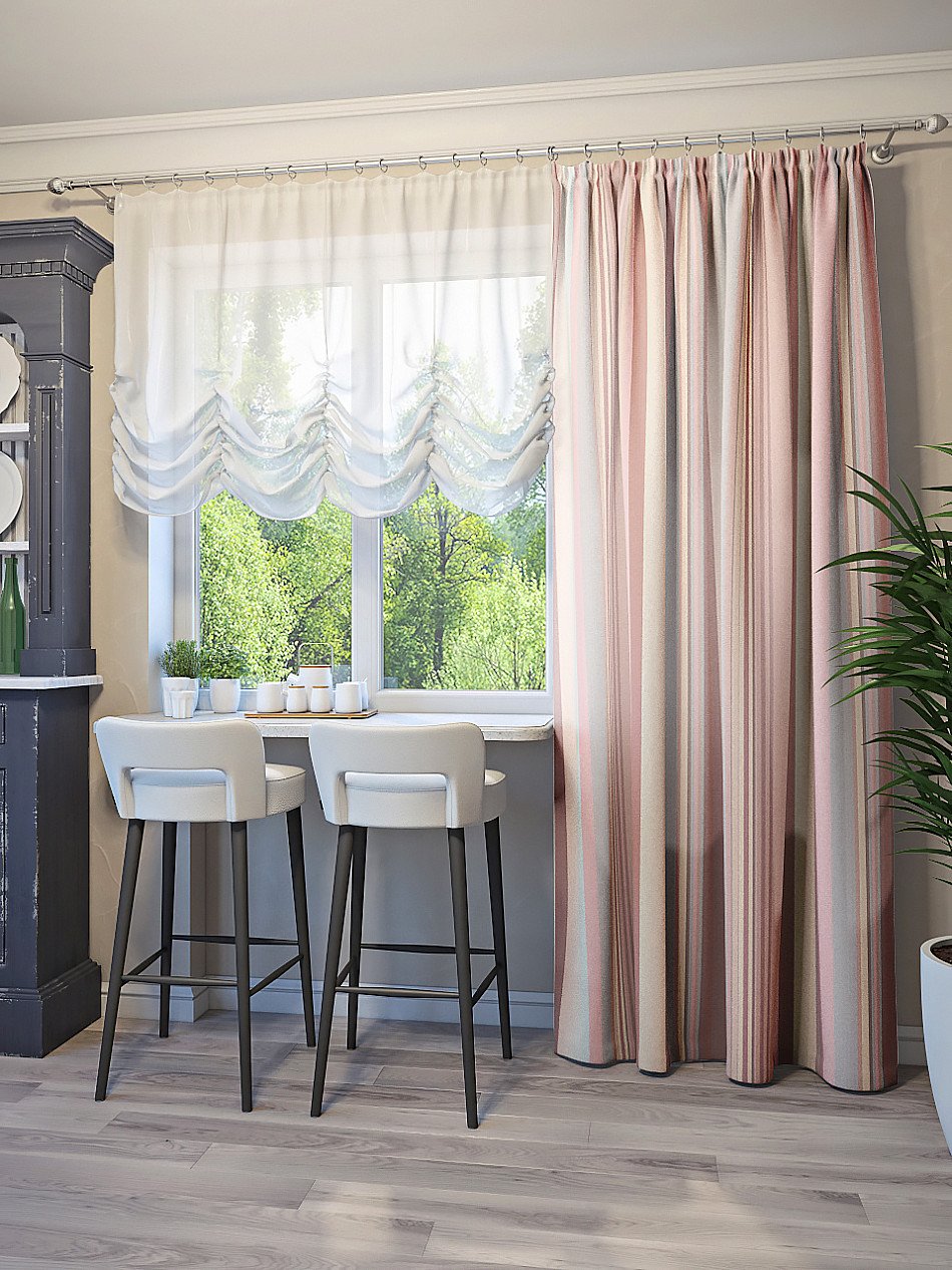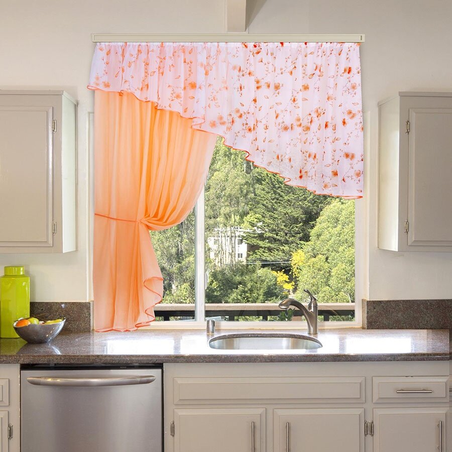 Un rideau unilatéral en tissu translucide avec une impression discrète rendra la cuisine plus lumineuse