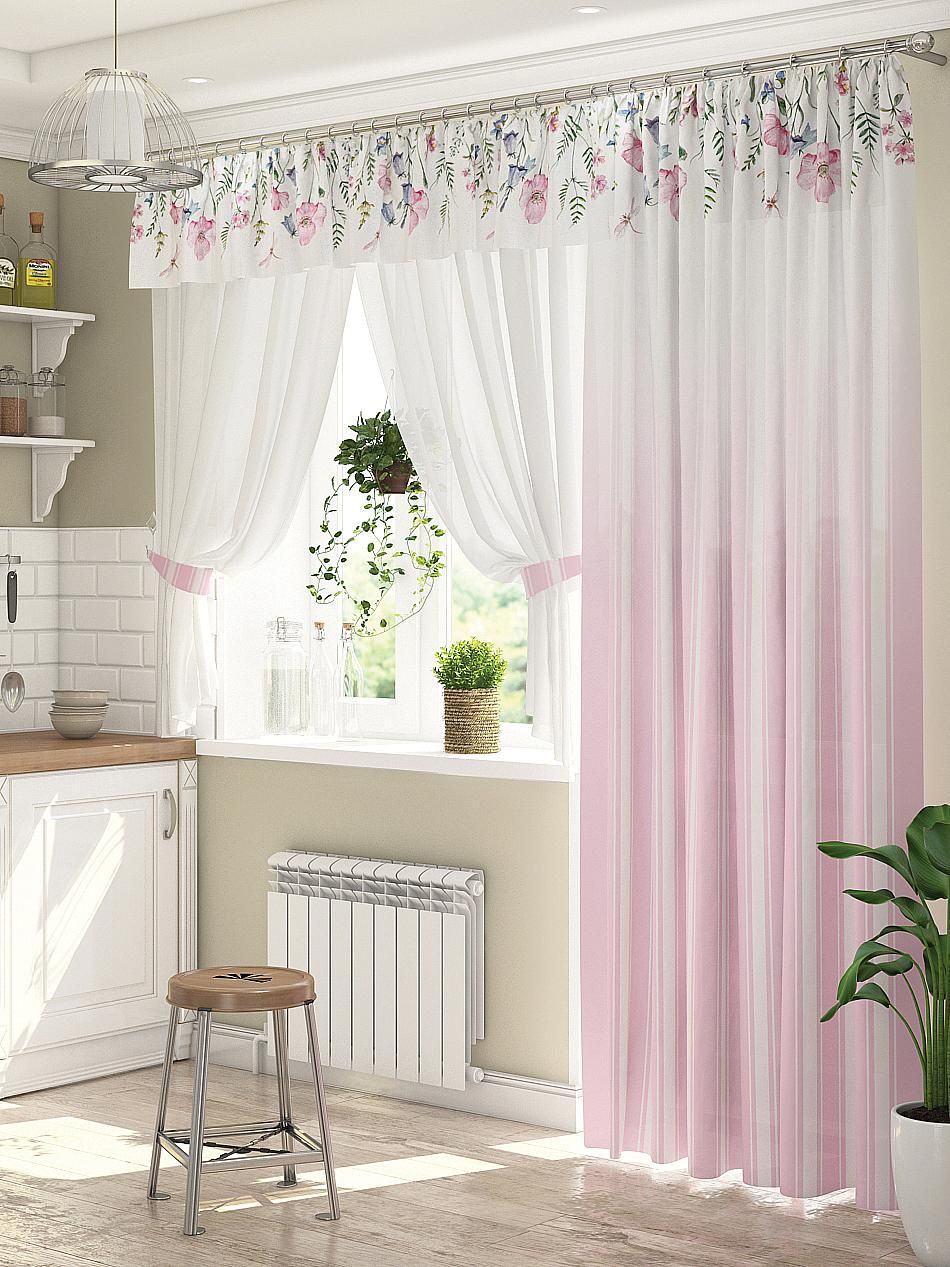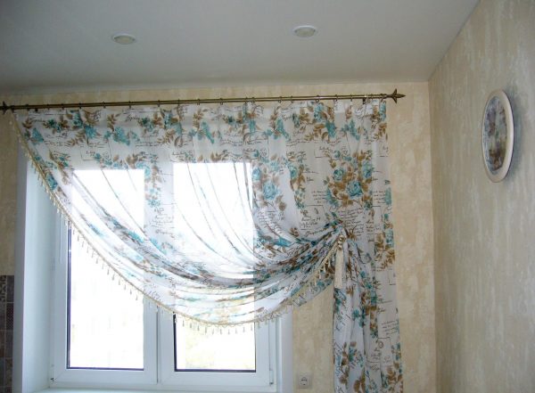 - Avec lambrequin. Le plus souvent, ces rideaux sont utilisés dans les cuisines décorées dans le style provençal. Dans ce cas, le coton, le lin et le chintz sont généralement utilisés comme tissus pour rideaux. La toile n'est pas fixée, mais enroulée librement sur le rebord. Le bord du lambrequin (lorsqu'il est enroulé) pend librement ou est ramassé par le cordon.