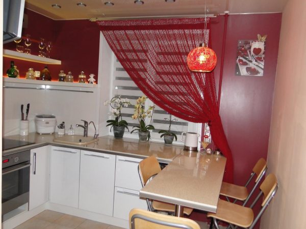 Il est très important que la couleur des rideaux ne réduise pas la surface déjà petite de la cuisine. Un petit ornement sur les rideaux ressemblera à des taches, de la saleté, une panachure désordonnée. Des rideaux unis avec un grand motif sur la toile sont préférables.