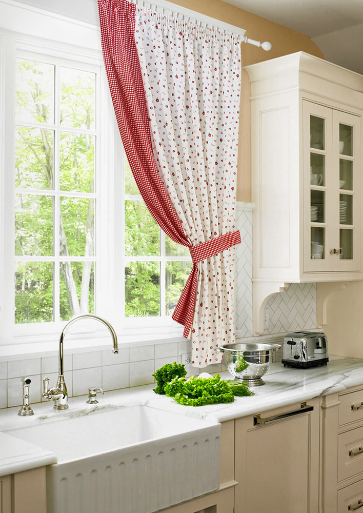 Lors du choix du tissu pour un rideau de cuisine, la préférence doit être donnée aux matériaux faciles à laver et ne se décolorent pas.