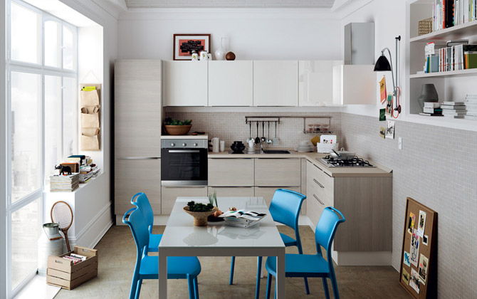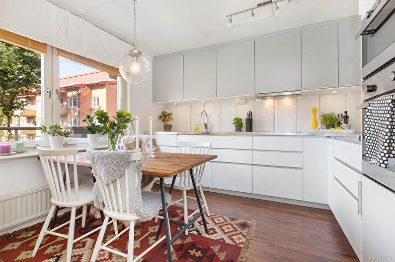 - Méthode à deux rangées - adaptée aux cuisines carrées spacieuses. La salle à manger et la zone de travail sont parallèles.