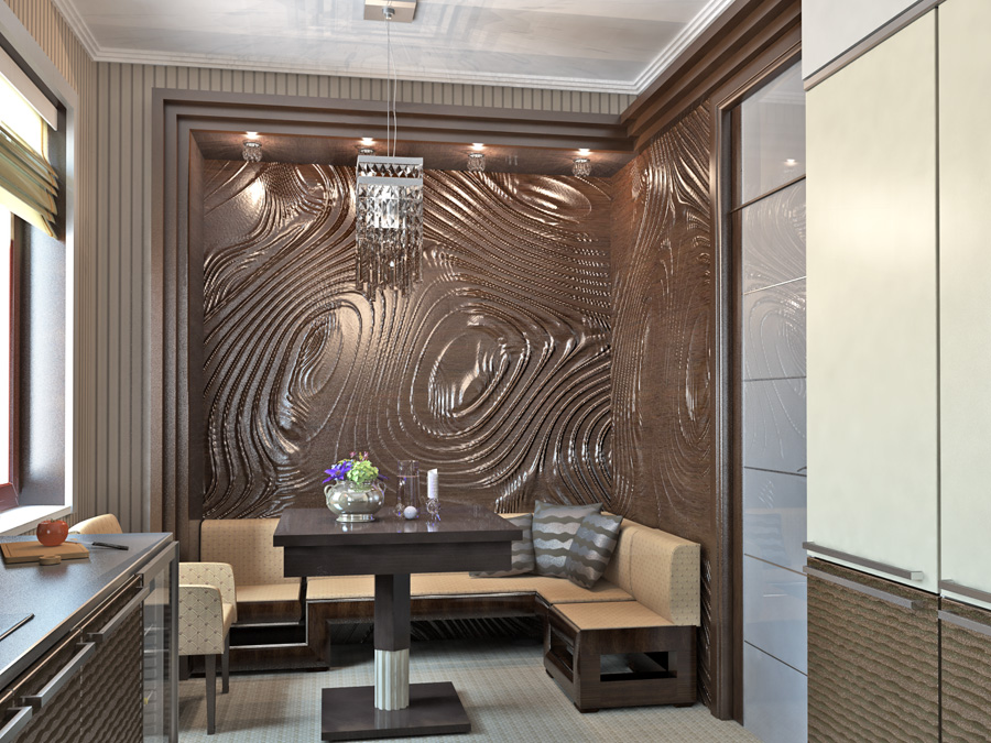 Lors de la formation d'une salle à manger tendre et lumineuse, elle doit être distinguée à l'aide de moyens décoratifs tels que: une conception intéressante du plafond, une décoration murale ou le choix d'un revêtement de sol inhabituel. Cependant, cela ne vaut pas la peine de combiner tous ces outils en même temps, cela chargera l'intérieur et le rendra difficile à percevoir.