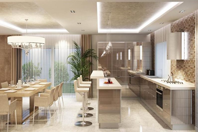 - Option 3. Une jolie salle à manger peut faire un plafond à plusieurs niveaux. Cela permettra d'installer de nombreux spots et d'agrandir visuellement toute la pièce, la rendant plus lumineuse. Un moyen idéal pour transformer une petite cuisine.