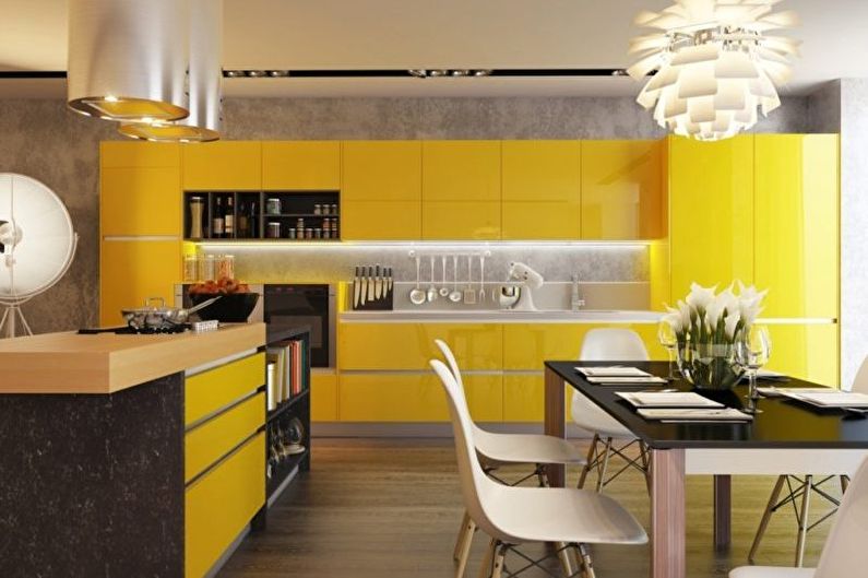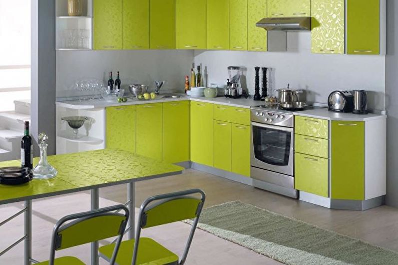 Les meubles sont mieux adaptés à la couleur de la cuisine. Le résultat sera positif si le comptoir est une nuance lumineuse ou des façades - combinées les unes aux autres.