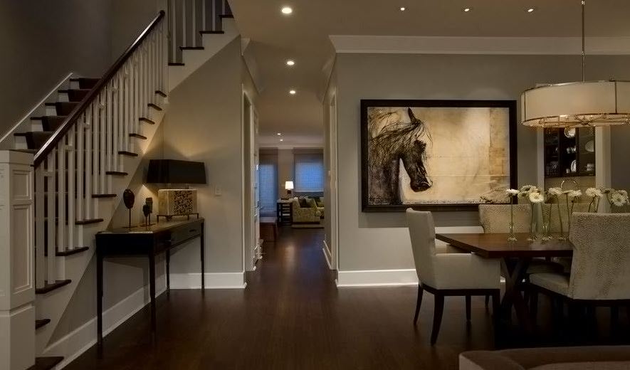 - La salle à manger, située au bord de la fenêtre, dispose déjà d'une source de lumière naturelle. Cependant, il devra être complété par un lustre situé au-dessus de la table à manger ou la formation d'un deuxième niveau de plafond. Il s'avérera de monter un certain nombre de projecteurs.