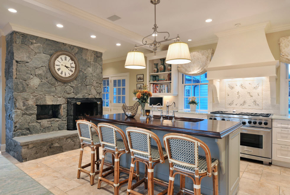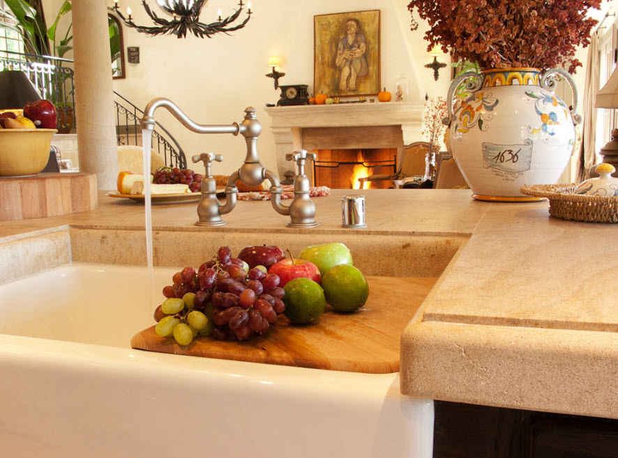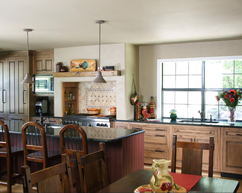 La finition des surfaces d'une telle cuisine ne nécessite pas de trucs spéciaux et de solutions technologiques complexes. Bien sûr, l'option idéale serait d'utiliser des matériaux naturels, cependant, en raison de leur coût élevé, ce n'est pas toujours possible. Par conséquent, il est parfaitement acceptable d'utiliser des matériaux qui imitent les textures naturelles.