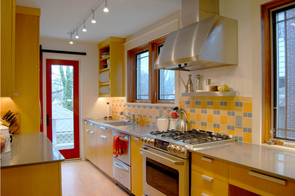 Vous pouvez diluer l'intérieur blanc avec un tablier fait de carreaux aux couleurs vives