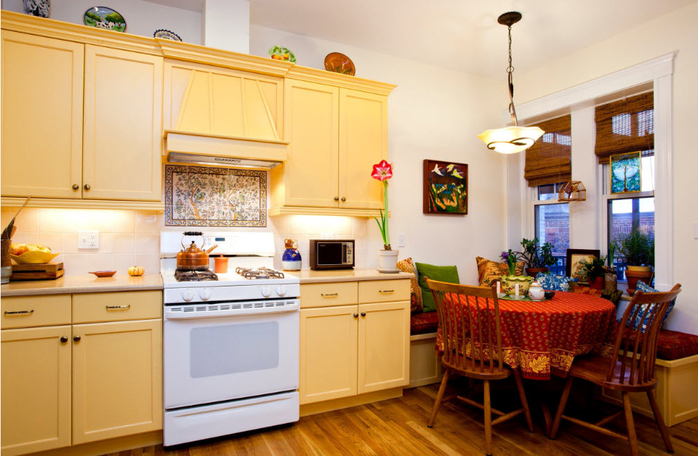 Pour commencer, avec un manque d'espace, la salle à manger peut être située dans le coin. Le canapé d'angle donnera plus de sièges, mais il aura l'air compact. Pour correspondre au style choisi, le groupe de salle à manger doit être décoré avec des textiles: nappes en coton ou en lin, belles serviettes, oreillers décoratifs confortables sur le canapé avec des motifs floraux, etc. Le motif peut être répété sur la vaisselle.