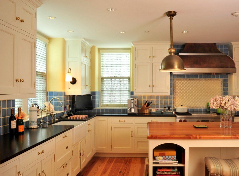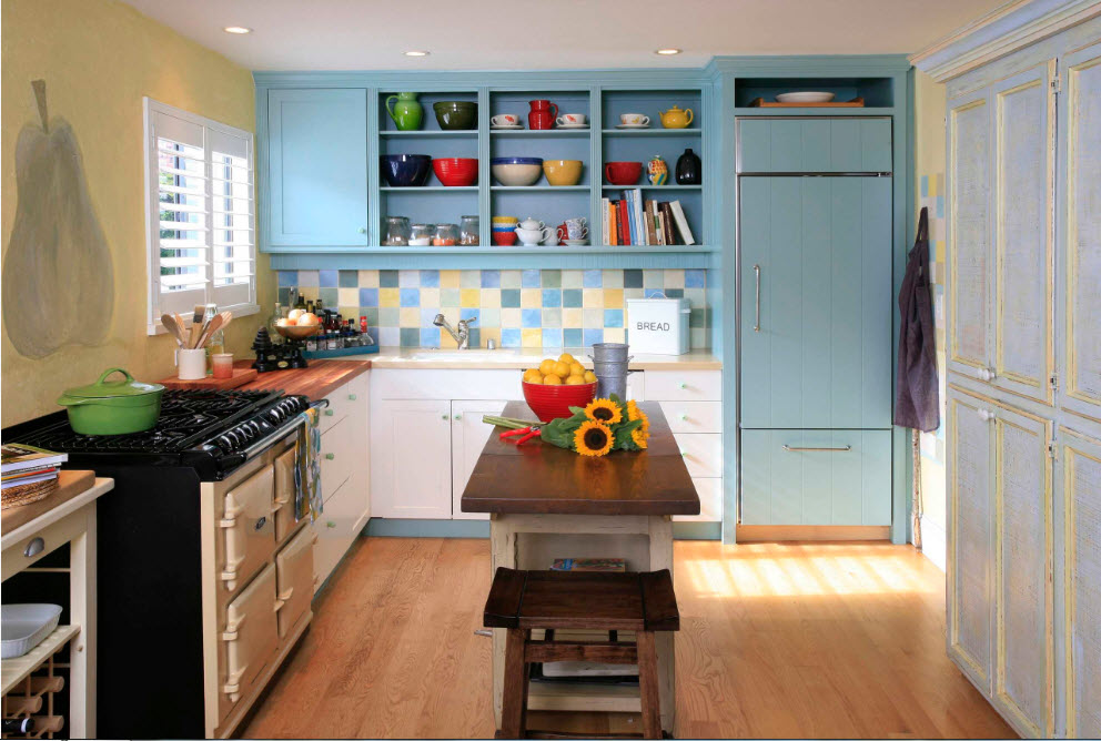 Dans une cuisine rustique, un ensemble de meubles peut être bleu