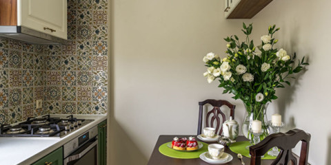 Dans une telle palette de couleurs, vous aurez une cuisine délicate qui incarne le calme et la tranquillité. Il y aura une atmosphère propice à des conversations amicales et sincères, soulagera la fatigue et vous préparera à un bon repos.