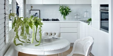 Pour le blanc, il est recommandé de dévier les niveaux supérieurs de la cuisine: plafond, armoires, murs. En outre, il s'avérera faire de beaux motifs. Un ensemble de cuisine bicolore est parfait, où la partie inférieure sera respectivement sombre - violette et supérieure - blanche.