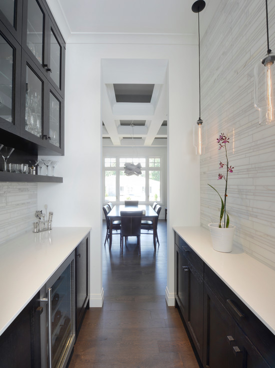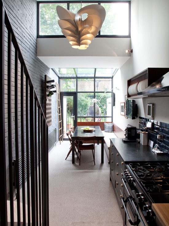 | Linéaire | Fournit l'emplacement de tous les meubles le long d'un mur. Dans ce cas, le réfrigérateur et la cuisinière doivent être situés sur différents côtés de l'évier. L'espace libre près d'un autre mur peut être utilisé pour organiser une salle à manger. Pour elle, cela vaut la peine de choisir une petite table, des chaises pliantes. Parfois, une table familière peut être remplacée par un comptoir élégant. Cette disposition créera le design parfait pour une cuisine étroite et longue. |