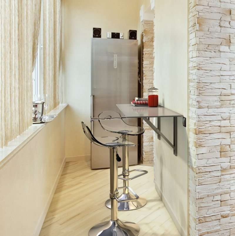 Le balcon adjacent à la cuisine étroite est un vrai cadeau! Avec lui, vous pouvez augmenter considérablement la zone utilisable. Cela nécessitera des coûts supplémentaires. Le balcon devra être correctement isolé, vitré. Vous ne pouvez confier le réchauffement qu'aux professionnels.Pour le travail, choisissez des matériaux de haute qualité et respectueux de l'environnement. Ils ne doivent pas être exposés à des processus de combustion. Vous ne pouvez pas économiser sur l'isolation! Ce n'est qu'alors qu'il sera possible d'y placer un coin repas.
