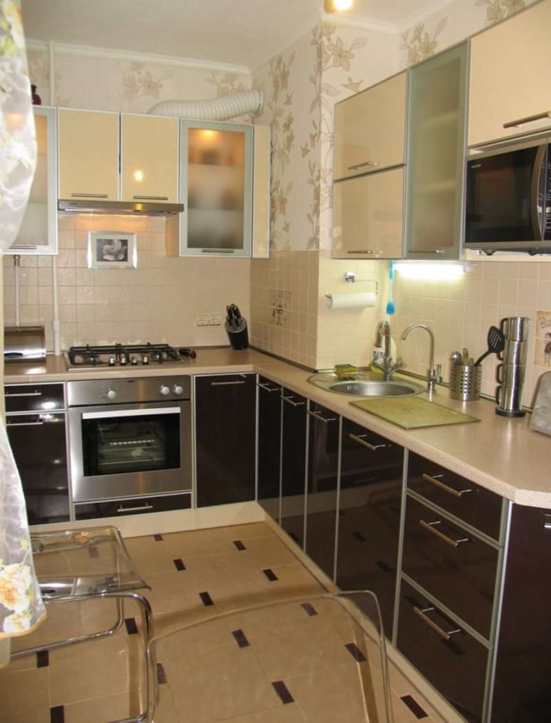 Les ensembles de cuisine transformés de haute qualité aideront les surfaces réfléchissantes et réfléchissantes. Le meilleur choix pour un petit espace sera un meuble brillant avec des inserts de miroir. Le brillant est pratique pendant le fonctionnement. Il n'absorbe pas la saleté, la graisse.