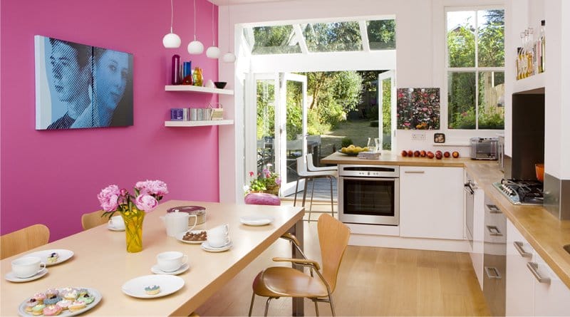 En peignant le mur en rose, vous soulevez visuellement le plafond de la cuisine