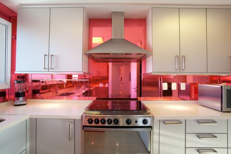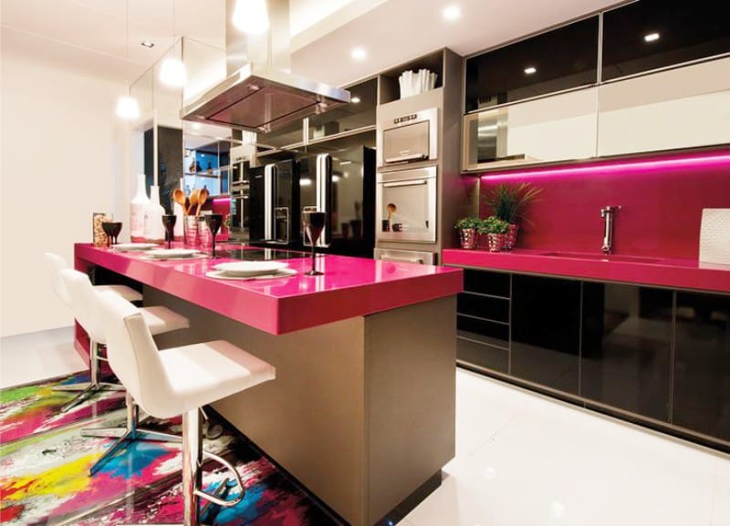 Une décision audacieuse consiste à mélanger le noir et le rose. Il est élégant et moderne. Par exemple, le comptoir est noir, les armoires sont rose vif et tout cela combiné avec un plafond miroir noir. Il s'agit d'un mouvement de conception intéressant adapté aux fans de solutions extravagantes.