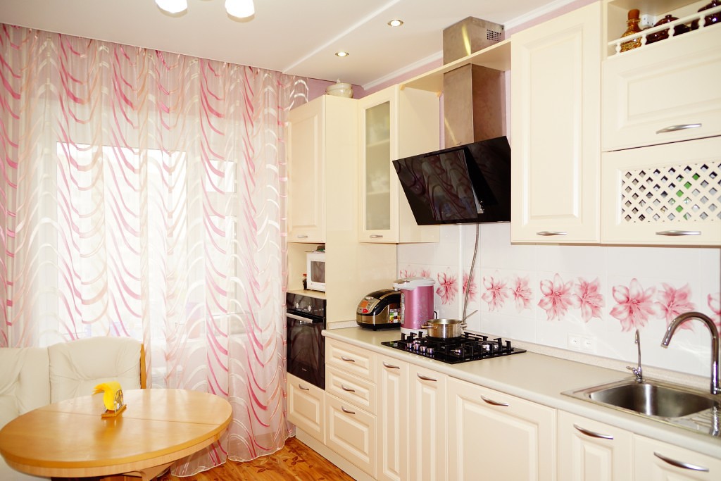 - Une cuisine rose mat avec un comptoir beige et des murs gris clair, et les accessoires sont des rideaux métalliques, gris clair avec de grandes fleurs roses ou unis avec des franges. La couleur blanche peut également être présente - évier, cuisinière, réfrigérateur, plafond, fenêtre.