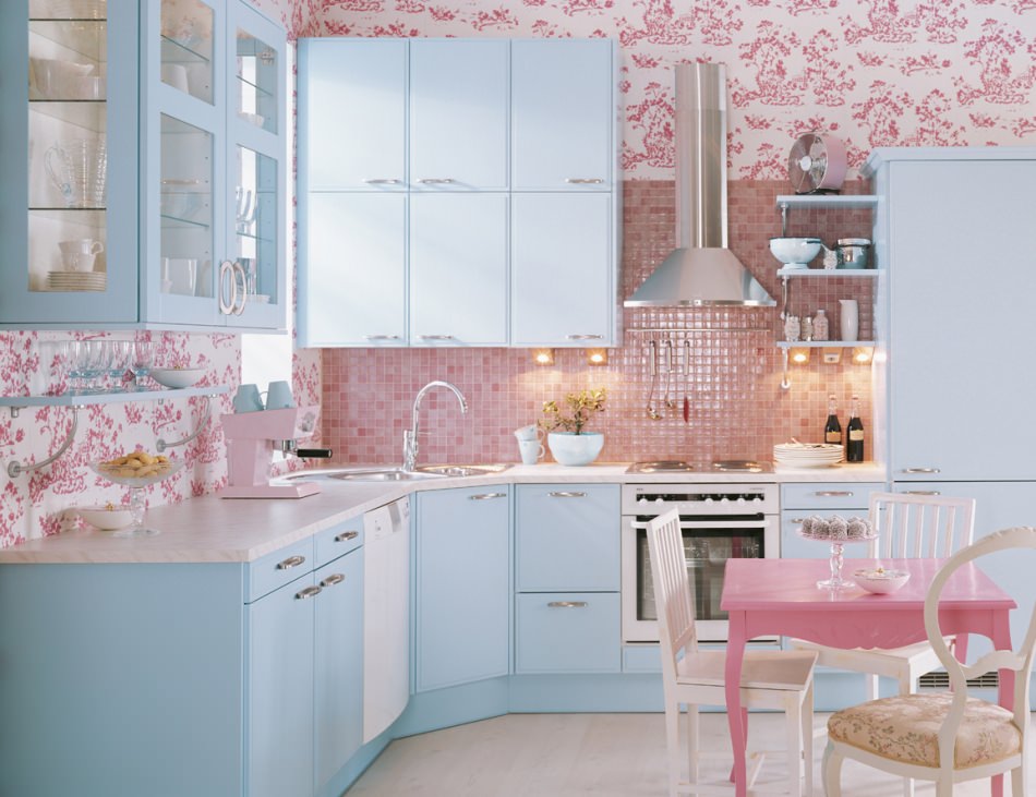 Si vous avez opté pour une cuisine rose, vous devez soigneusement choisir la palette de couleurs de tous les détails intérieurs.