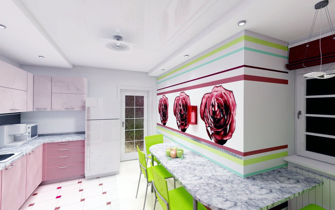 Le papier peint rose dans la cuisine est inhabituel et beau. Vous pouvez choisir un papier peint pour la peinture, ce qui est très pratique, car ils sont faciles à repeindre si vous êtes fatigué ou si vous voulez simplement rafraîchir les murs.