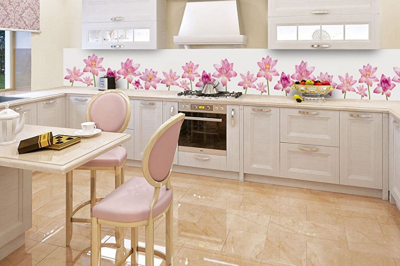 Un tablier fait partie du mur, entre les armoires supérieure et inférieure. Ces endroits sont les plus contaminés et sont généralement recouverts de carreaux ou de plastique afin de pouvoir être facilement lavés. Le tablier doit s'intégrer harmonieusement à l'intérieur. Il est important de choisir la bonne couleur pour le tablier. Si les meubles de cuisine sont de couleurs vives, vous pouvez choisir un tablier rose crème. Des rideaux ou des nappes rose pâle seront un excellent complément au design. Il ne sera pas inutilement encombré de couleurs vives, mais donnera à la pièce fraîcheur et originalité.