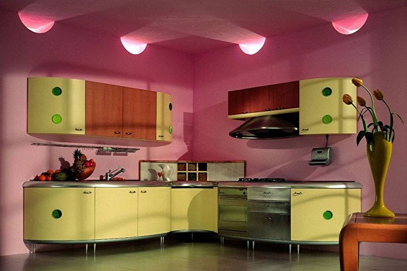 L'intérieur de la cuisine avec des meubles roses peut être favorablement souligné à l'aide d'éléments décoratifs lumineux