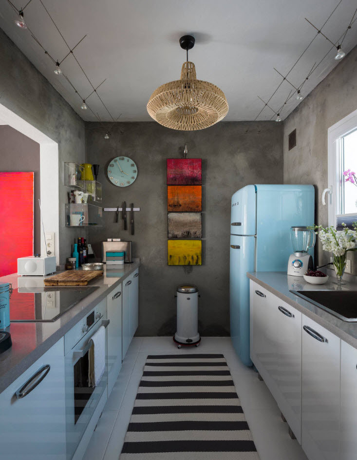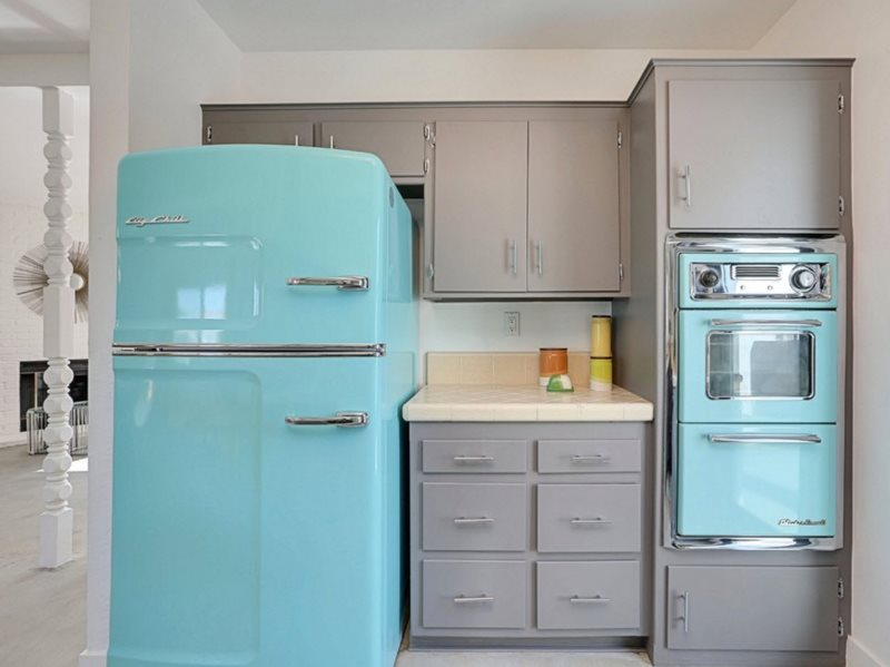 Pour l'intérieur ne semble pas trop sombre, vous devez ajouter des accents lumineux. Dans ce mode de réalisation, ce rôle est joué par un réfrigérateur vintage de couleur verte.