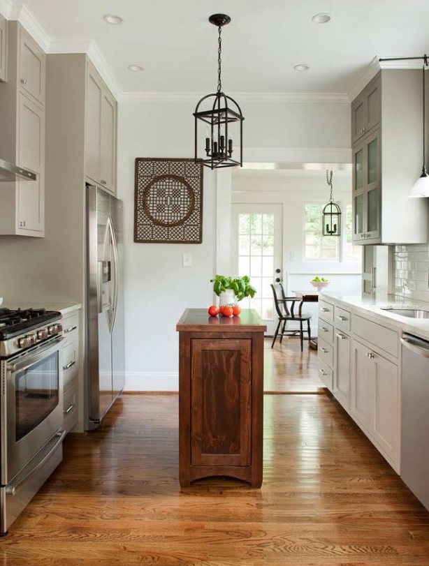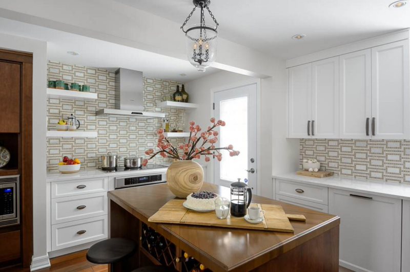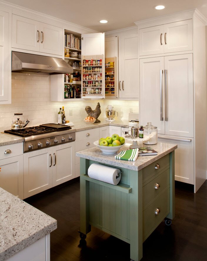 Dans la cuisine carrée, vous pouvez installer un petit îlot au centre, ce qui est pratique à utiliser comme surface de travail supplémentaire ou comme endroit pour des repas courts