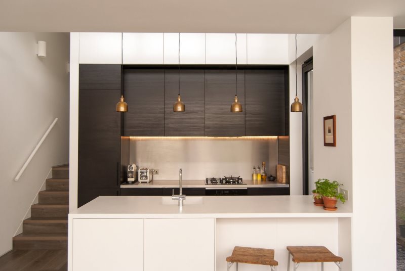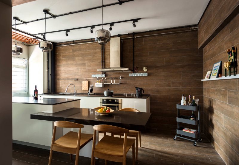 Il est recommandé de diluer les combinaisons contrastées de surfaces sombres et claires avec un ton intermédiaire, le plus souvent elles utilisent du bois naturel ou son imitation
