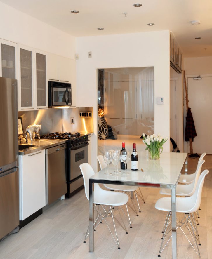 - Le verre augmentera visuellement la superficie de la cuisine-salle à manger. Le verre est un matériau polyvalent et élégant. Il peut être présent dans le revêtement de façade. Les portes en verre sur les armoires ont fière allure. Le verre peut être une table à manger. Les meubles en verre sont faciles à nettoyer, conviennent à presque tous les styles, sont solides et durables.