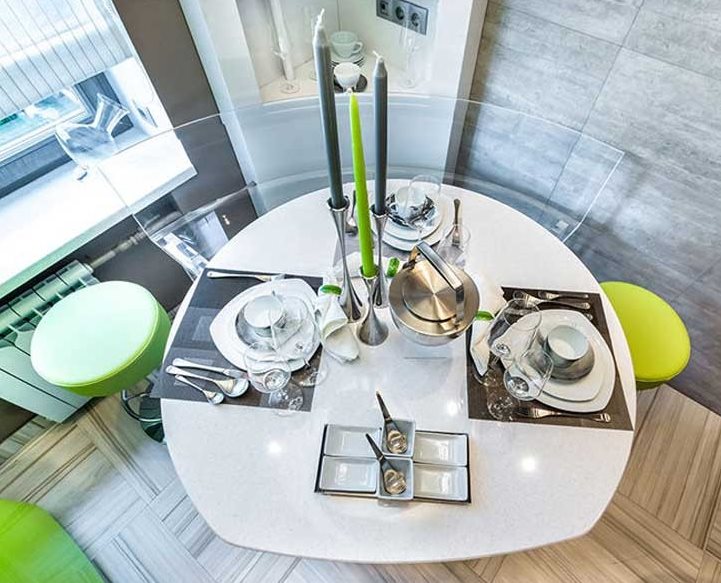 Pour une grande famille, il est préférable d'utiliser une table ronde ou ovale, ce qui vous permet de placer le nombre maximum de convives dans un espace minimum