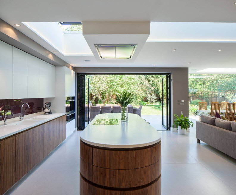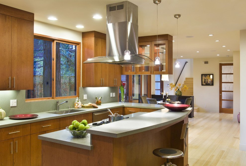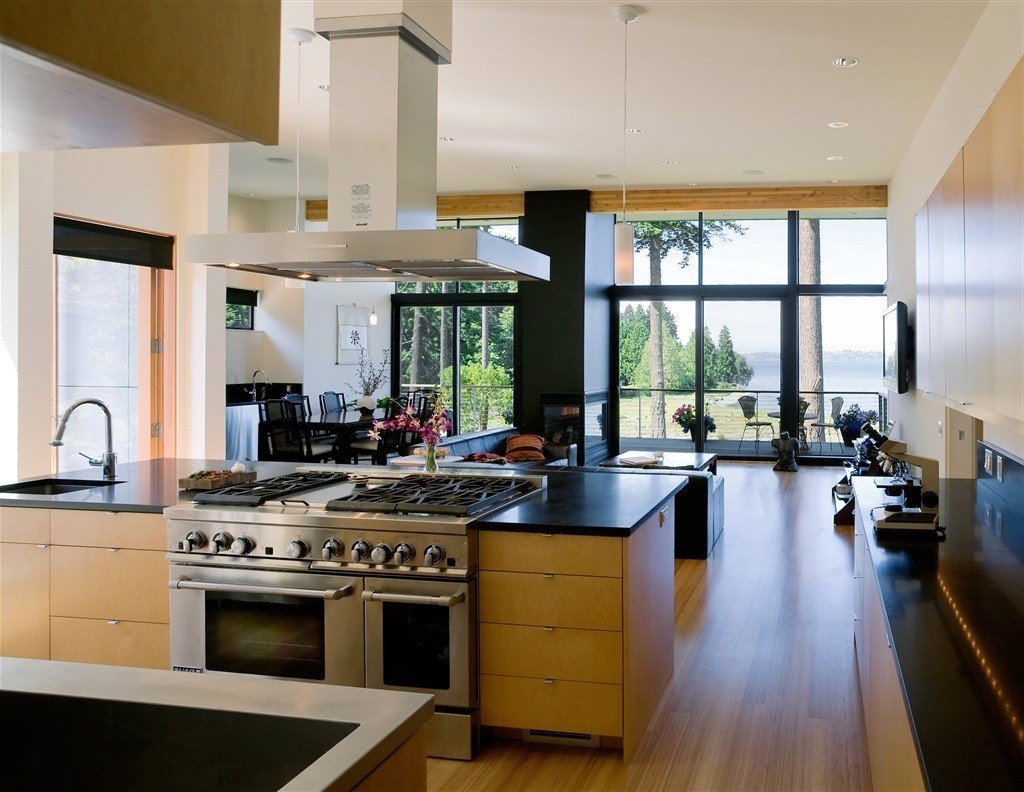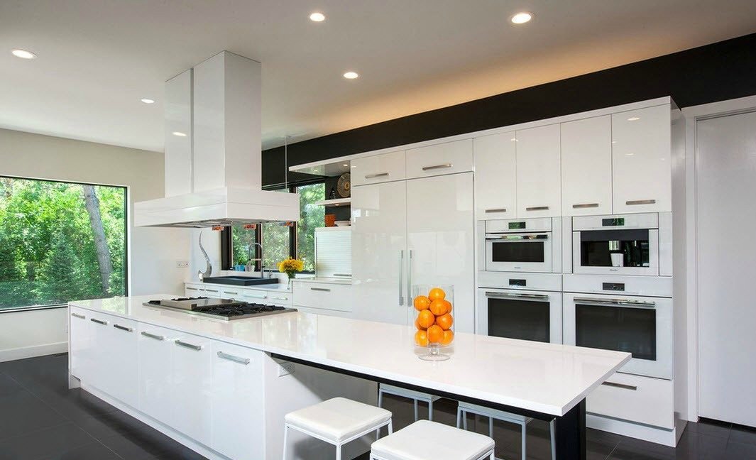 Le type ouvert est très populaire lors de la planification d'appartements, ce qui nécessite l'installation de hottes puissantes et de haute qualité. Les femmes au foyer modernes sont bien conscientes que la hotte aide à se débarrasser de nombreuses odeurs désagréables sous forme de brûlures et autres. En outre, avec la bonne sélection, elle sera en mesure de maintenir le plafond blanc comme neige, les murs et même la propreté des armoires suspendues.