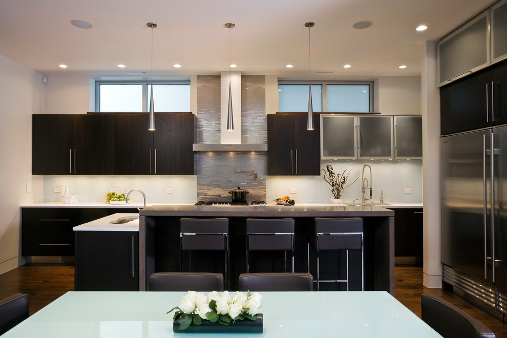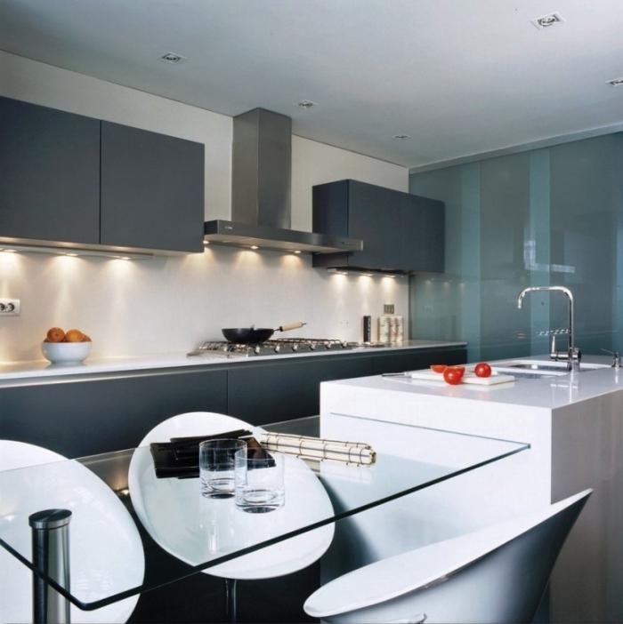 Pour une cuisine au design moderne, une hotte aspirante avec un boîtier en acier inoxydable en combinaison avec un verre trempé spécial est parfaite.