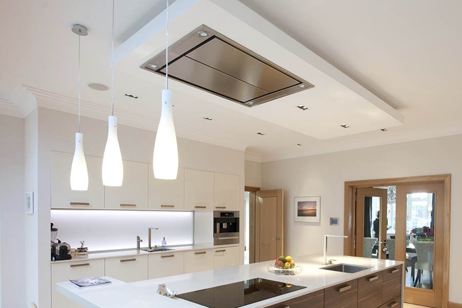 Cette hotte peut également être appelée île en raison de son emplacement. Il représente une boîte posée au plafond, et l'air est évacué par des tuyaux de ventilation cachés derrière un plafond suspendu