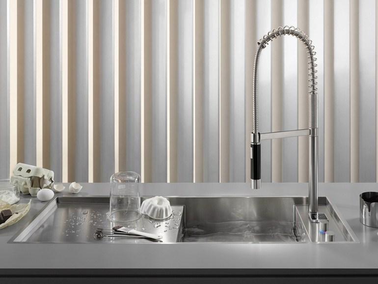 Aujourd'hui, le marché de la plomberie a des éviers à trois sections. Pour eux, vous devrez également acheter un mélangeur, un arrosoir rétractable.