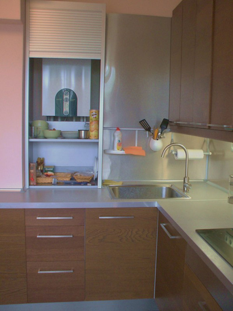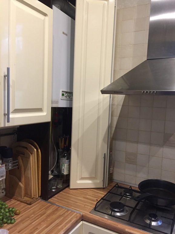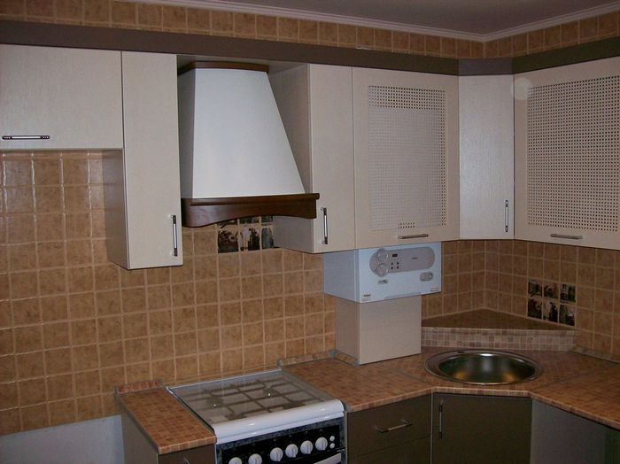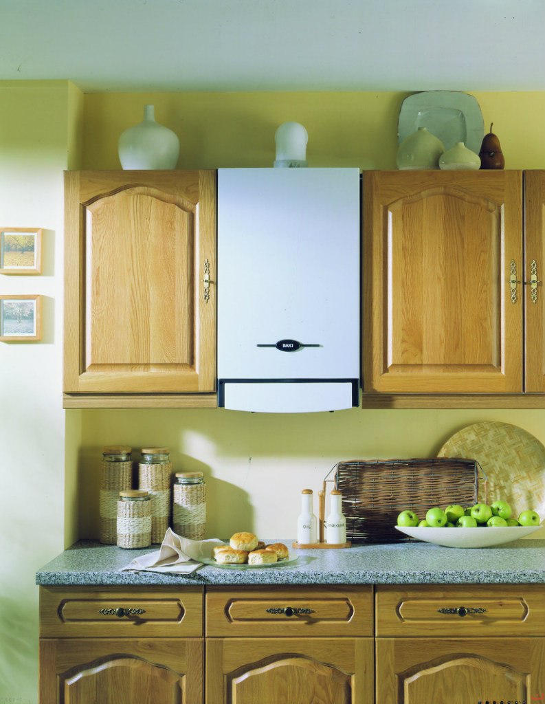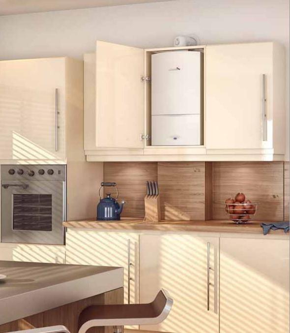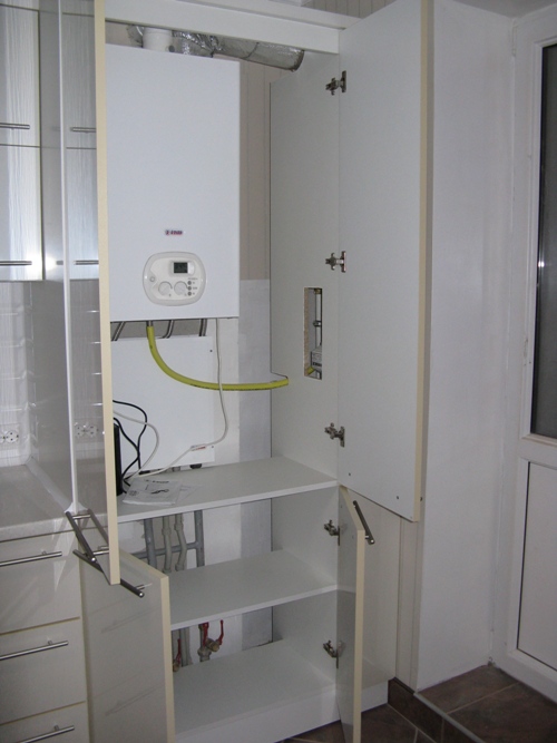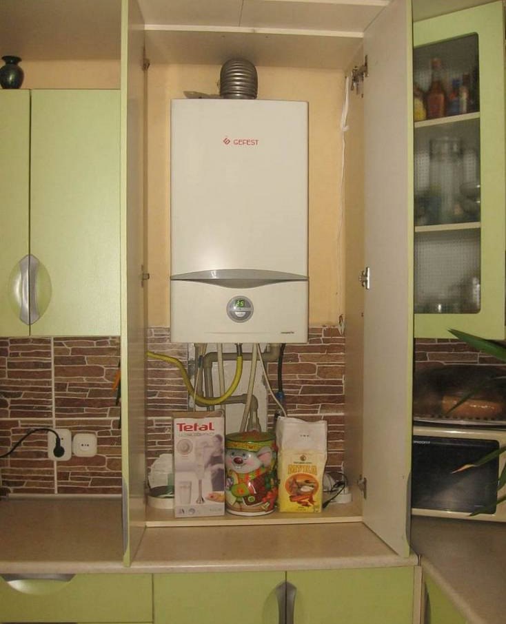- l'utilisation de façades de meubles qui couvrent la chaudière à gaz sur la surface avant, et les parois latérales sont à l'intérieur de l'armoire.